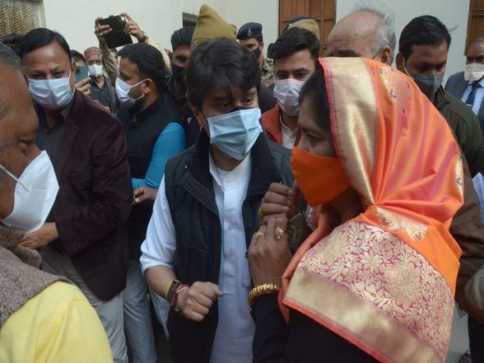 ग्वालियर। एक दिवसीय प्रवास पर गुरुवार दोपहर ग्वालियर आए नागरिक उड्डयन मंत्री ज्योतिरादित्य सिंधिया ने लघु उद्योग विकास निगम की अध्यक्ष इमरती देवी को क्लीनिकल मास्क लगाने की हिदायत दी। उन्होंने कहा- कपड़े का मास्क पहनने से कोरोना वायरस नहीं रुकता। इसलिए आपको क्लीनिकल मास्क लगाना चाहिए। सिंधिया की हिदायत सुनने के बाद इमरती देवी ने कान पकड़कर कहा- गलती हो गई महाराज।